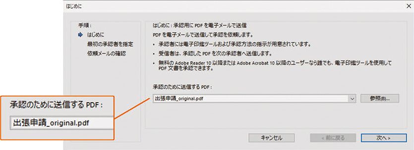2 送信ウィザードが起動するので、はじめに承認用のPDFを選択し、「次へ」ボタンをクリックします。