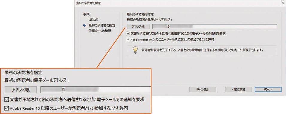 3 次に、最初に承認を依頼するユーザーのメールアドレスを指定します。Acrobat を利用している場合、「Adobe Reader 10 以降のユーザーが承認者として参加することを許可」にチェックを入れておくと、Adobe Reader 10以降のユーザーも承認に参加できるようになります。