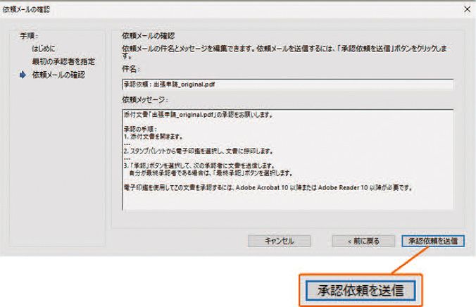4 必要に応じてメールの件名と本文を変更し、「承認依頼を送信」をクリックすると、最初の承認者へPDFが添付された状態で依頼メールが送信されます。