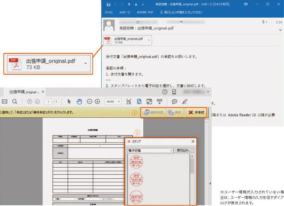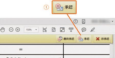 1 承認依頼メールに添付されているPDFを開きます。PDFを開くと文書メッセージバーに「最終承認」、「承認」、「非承認」のボタン①が表示され、承認プロセスを進めることができるようになっています。また「電信印鑑」スタンプパレット②が表示されるので、この中から任意のスタンプを選ぶこともできます。