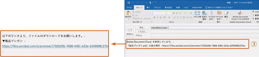 2 ファイルのアップロードが完了すると、メッセージの本文にリンクが挿入されます③。テキストの内容は変更可能なので、適宜本文を打ち変え、メールを送信します。