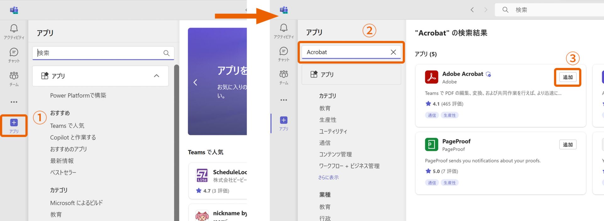 Teamsの画面で「アプリ」アイコン①をクリックし、アプリが表示されたら検索窓に「Acrobat」と入力②するとAdobe Acrobatが表示されるので、「追加」③をクリックします(インストールは最初の⼀度のみ必要)。