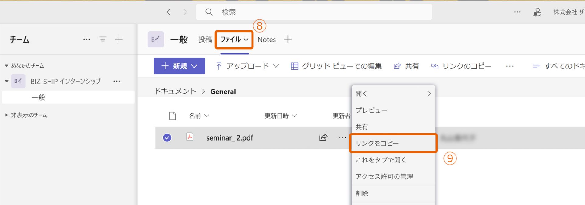 3. レビューされたPDFファイルは「ファイル」⑧に格納されているので後から内容を確認することもできます。さらにリンクをコピー⑨することで、チームメンバー以外と共有することもできます。