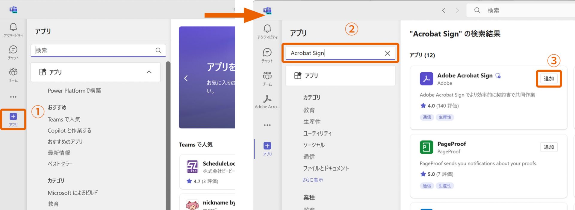 1. Teamsの画面で「アプリ」アイコン①をクリックし、アプリが表示されたら検索窓に「Acrobat Sign」と入力②するとAdobe Acrobat Signが表示されるので、「追加」③をクリックします。(インストールは最初の⼀度のみ必要)