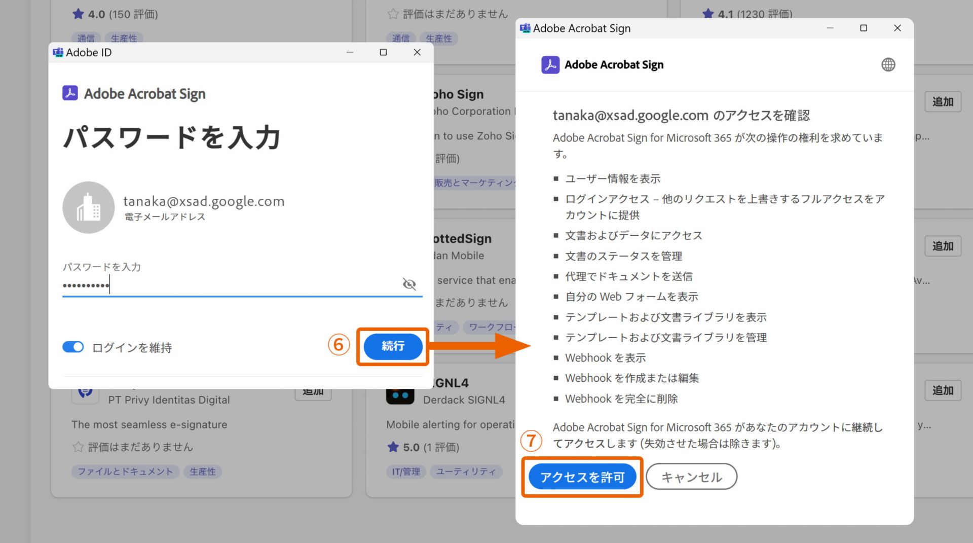 3. 次にAdobe IDのパスワードを入力して⑥、「続行」をクリックし、アクセスの確認画面で「アクセスを許可」⑦をクリックします。
