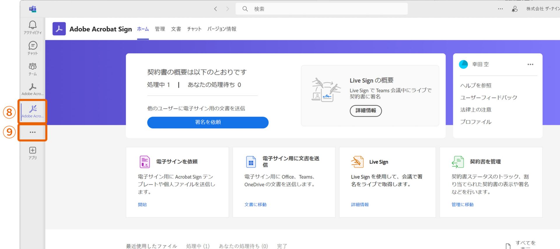 4. Acrobat Signの拡張機能がインストールされ、左側のメニューバーにAcrobat Signが追加され⑧、アクセスしやすくなります。表⽰されていない場合は「…」⑨をクリックして表⽰または検索することができます。