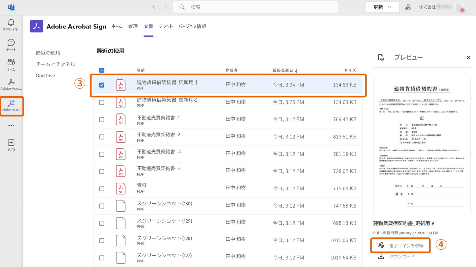 2. 左のメニューから「Adobe Acrobat Sign」アイコンをクリックします。「文書」タブに署名用の文書が表示されるので任意の文書を選択し③、「電子サインを依頼」④をクリックします。