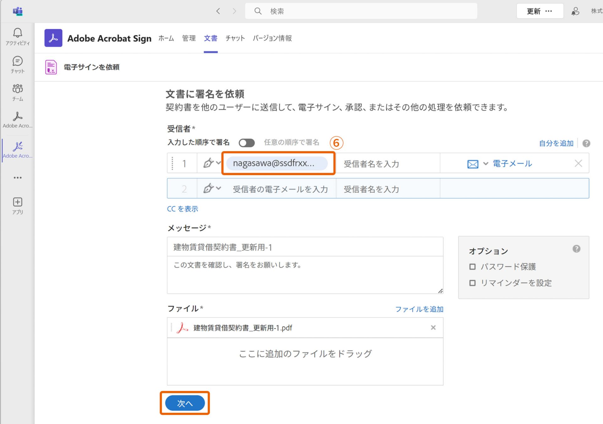 4. 次の画面で署名者のメールアドレスが表示されていることを確認し⑥、「次へ」をクリックします。