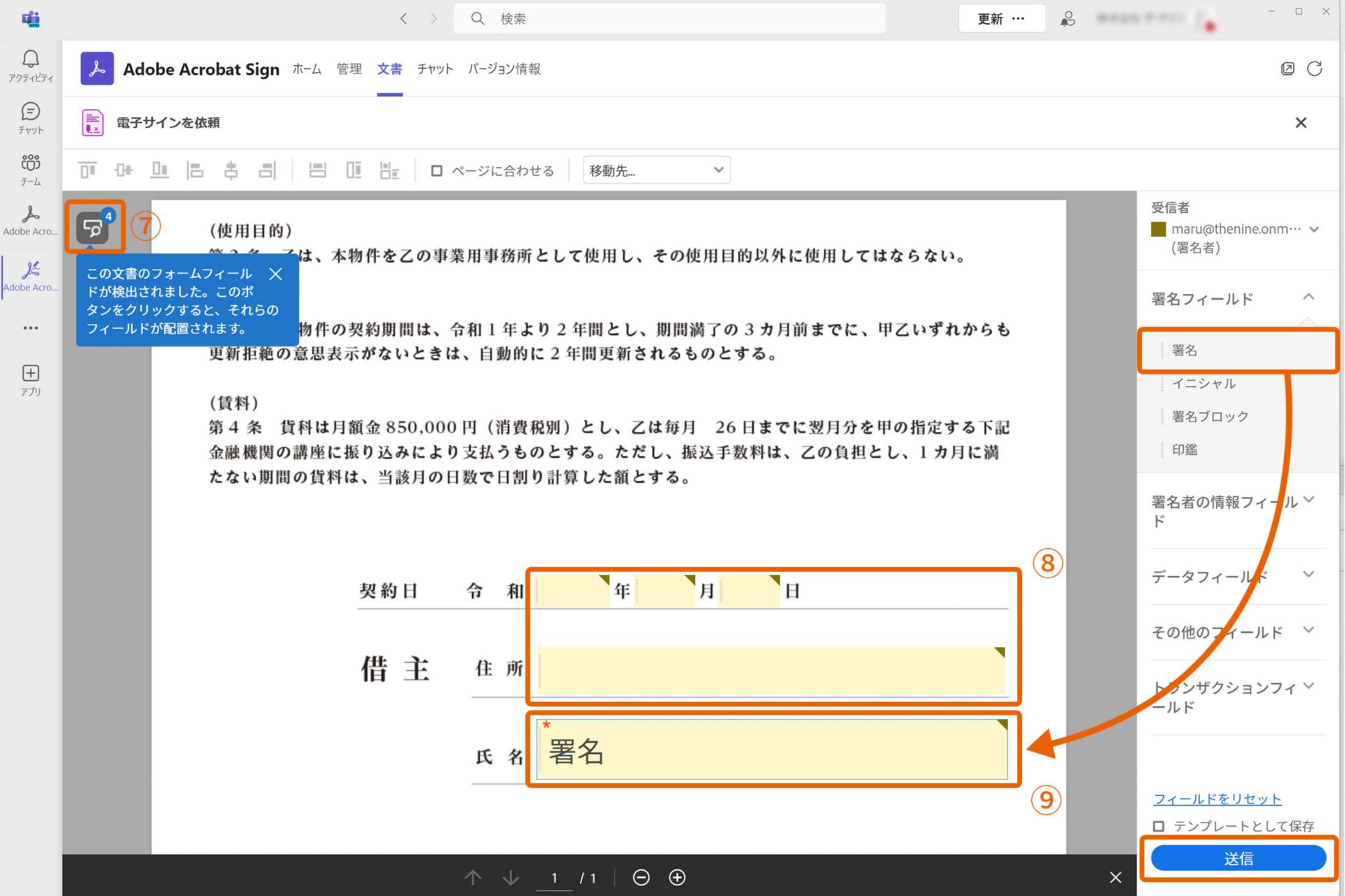 5. 契約書が表示され、文書のフォームフィールドが検出されるので、アイコン⑦をクリックするとテキスト入力フィールドが自動で配置⑧されます。右パネルから署名フィールドをドラッグ&ドロップで配置して大きさを調整⑨し、「送信」ボタンをクリックします。