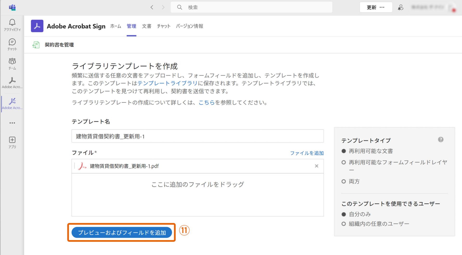 8. 「ライブラリテンプレートを作成」画面で「プレビューおよびフィールドを追加」⑪をクリックします。