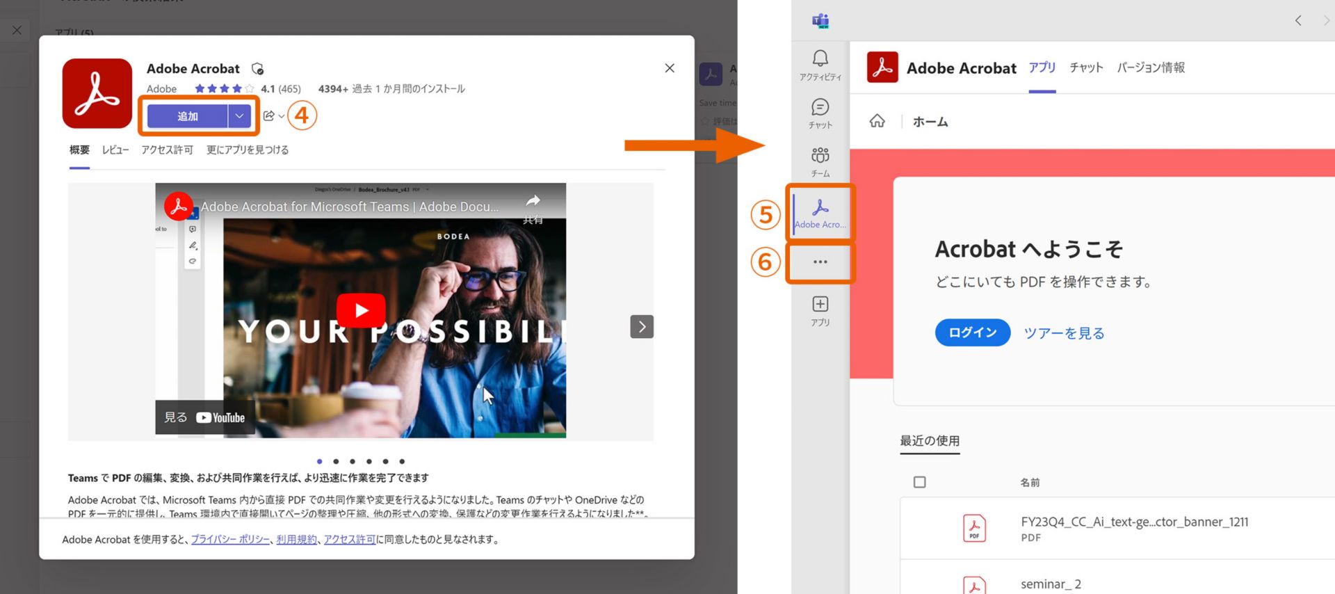 1. 次の画面で「追加」ボタン④をクリックし、Acrobatの拡張機能をインストールします。Acrobatの拡張機能がインストールされると、左側のメニューバーにAcrobatが追加され⑤、アクセスしやすくなります。表示されていない場合は「…」⑥をクリックして表示または検索することができます。