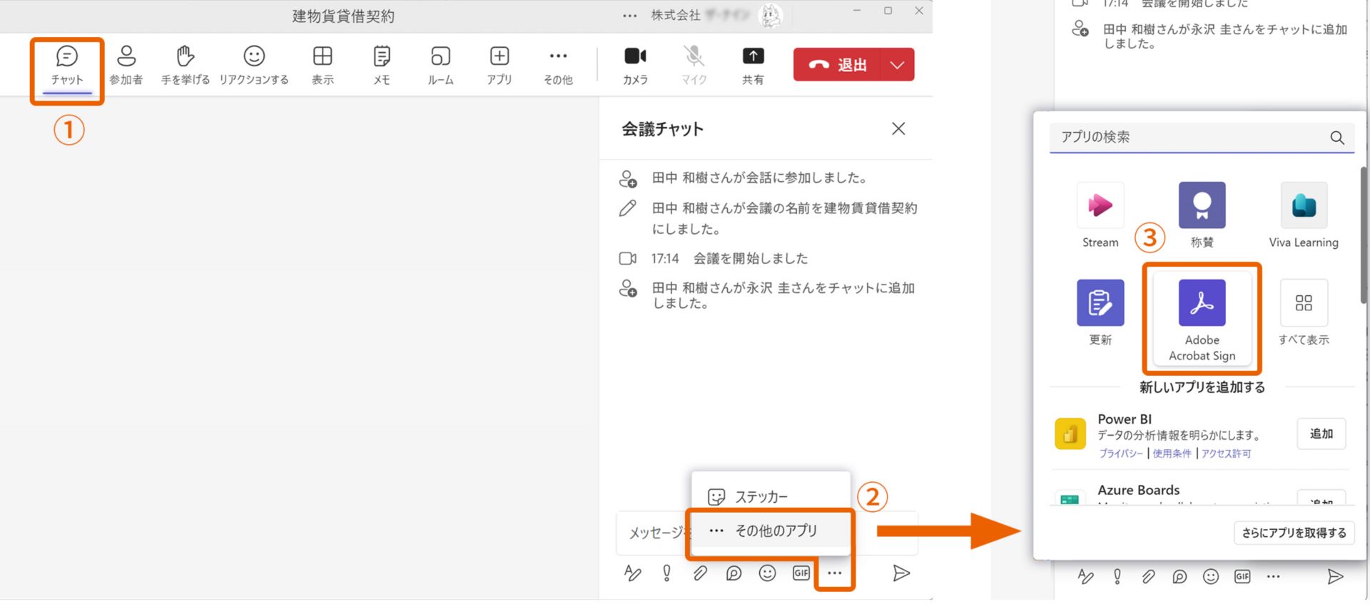 1. 対象署名者とのMicrosoft Teams ミーティングを設定します。トップメニューから「チャット」①を選択し、「会議チャット」パネルを開きます。パネル下にあるメニュー「…」から「その他のアプリ」②を選択します。