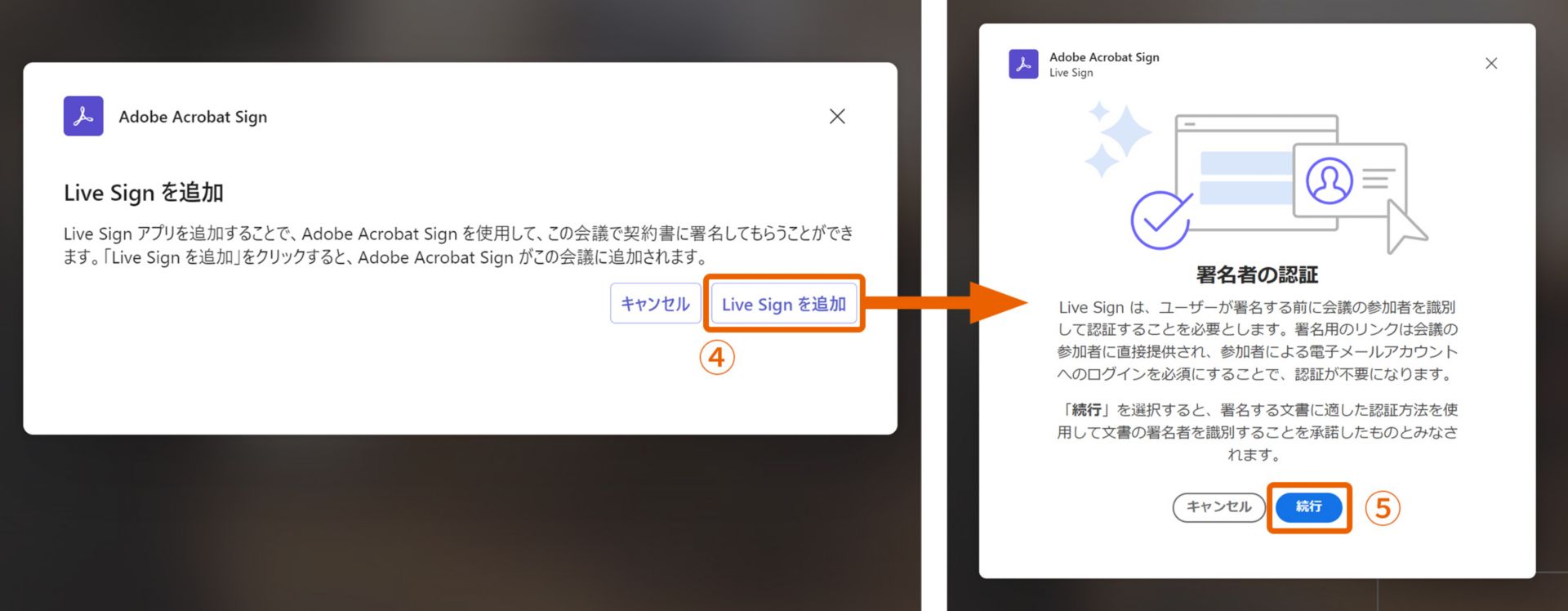2. 次の画面で「Live Sign を追加」④を選択します。「署名者の認証」が表示されたら、「続行」⑤を選択し、会議の参加者を識別および認証します。