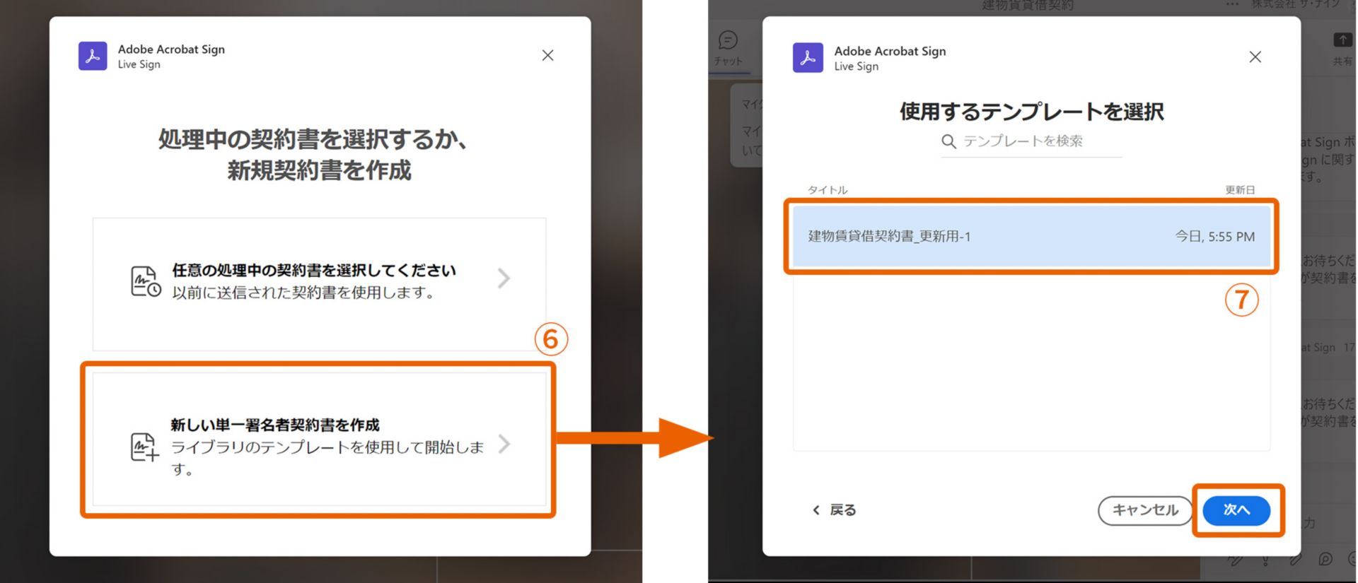3. 処理中の契約書を選択するか、新規契約書を作成するかを選択するダイアログが表示されます。ここでは「新しい単一署名者契約書を作成」⑥を選択して、次の画面で使用するテンプレートを選択し⑦、「次へ」をクリックします。