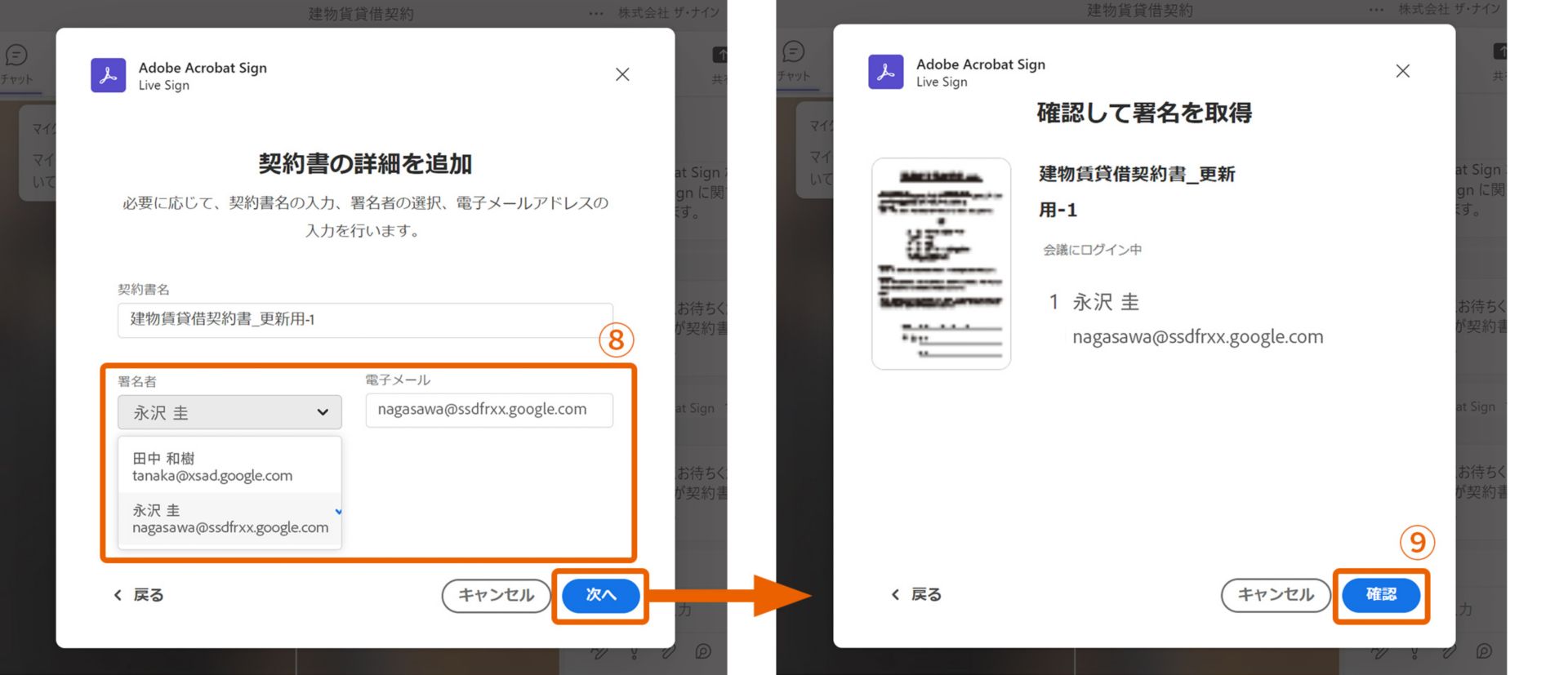 4. ドロップダウンメニューから署名者を選択し⑧、「次へ」をクリックします。署名取得の確認ダイアログが表示されたら、署名してもらう契約書と署名者を確認して「確認」⑨をクリックします。