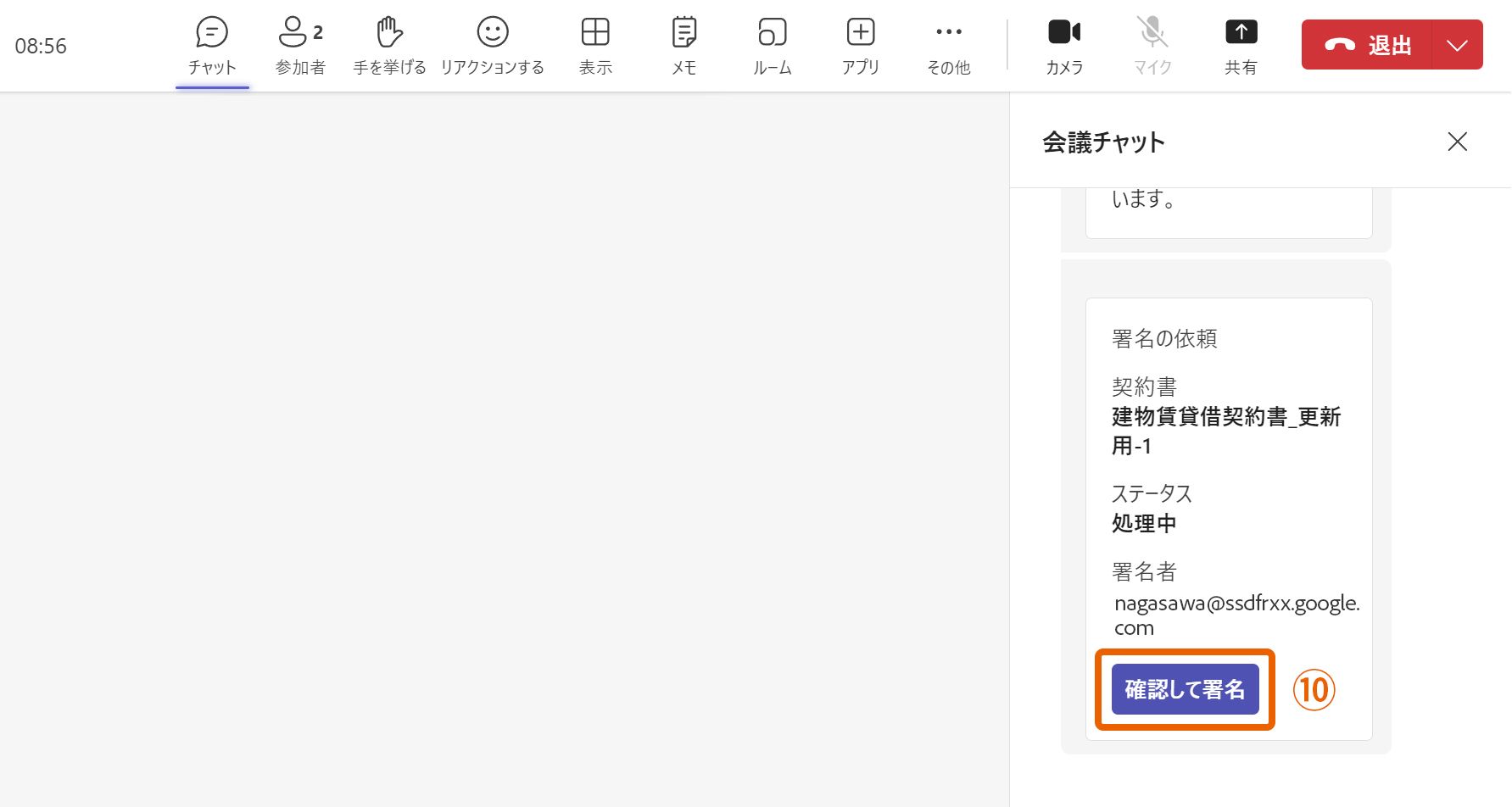 5. 会議チャットパネルで「確認して署名」⑩をクリックして画面を共有するように署名者に依頼します。
