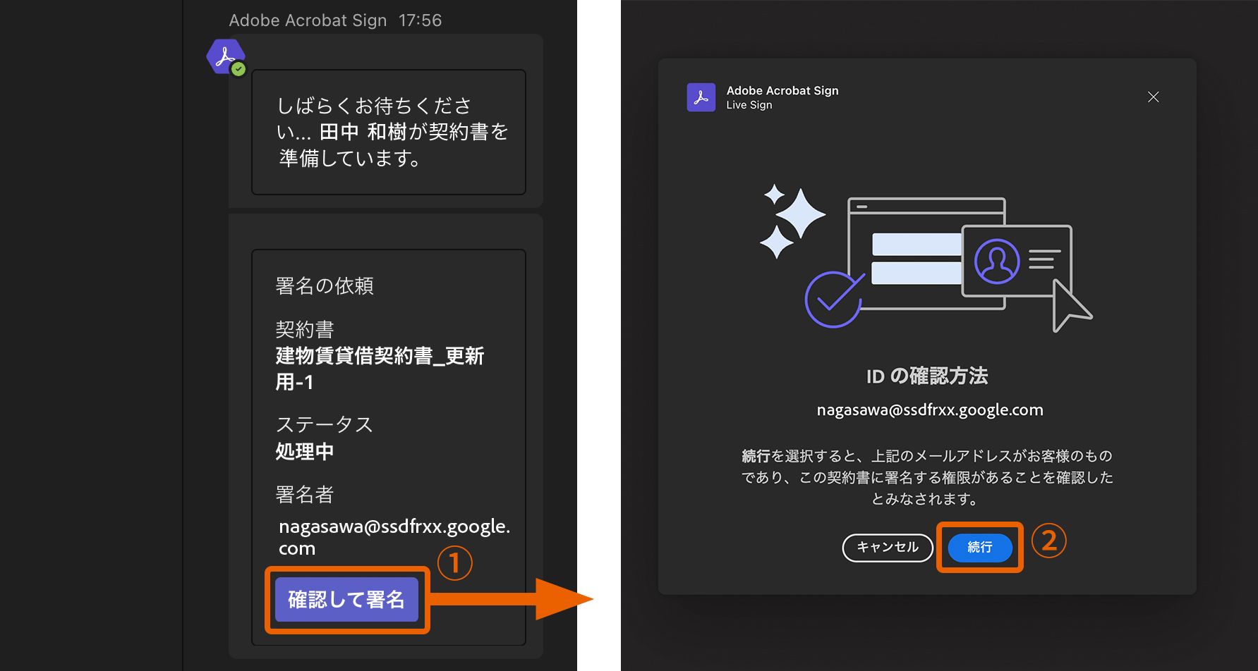 1. 署名者は「会議チャット」パネルで「確認して署名」①をクリックすると、本人であることを確認する画面が表示されるので「続行」②をクリックします。(参加者全員にリンクが表示されますが、署名者のみがリンクにアクセスして署名することができます)。