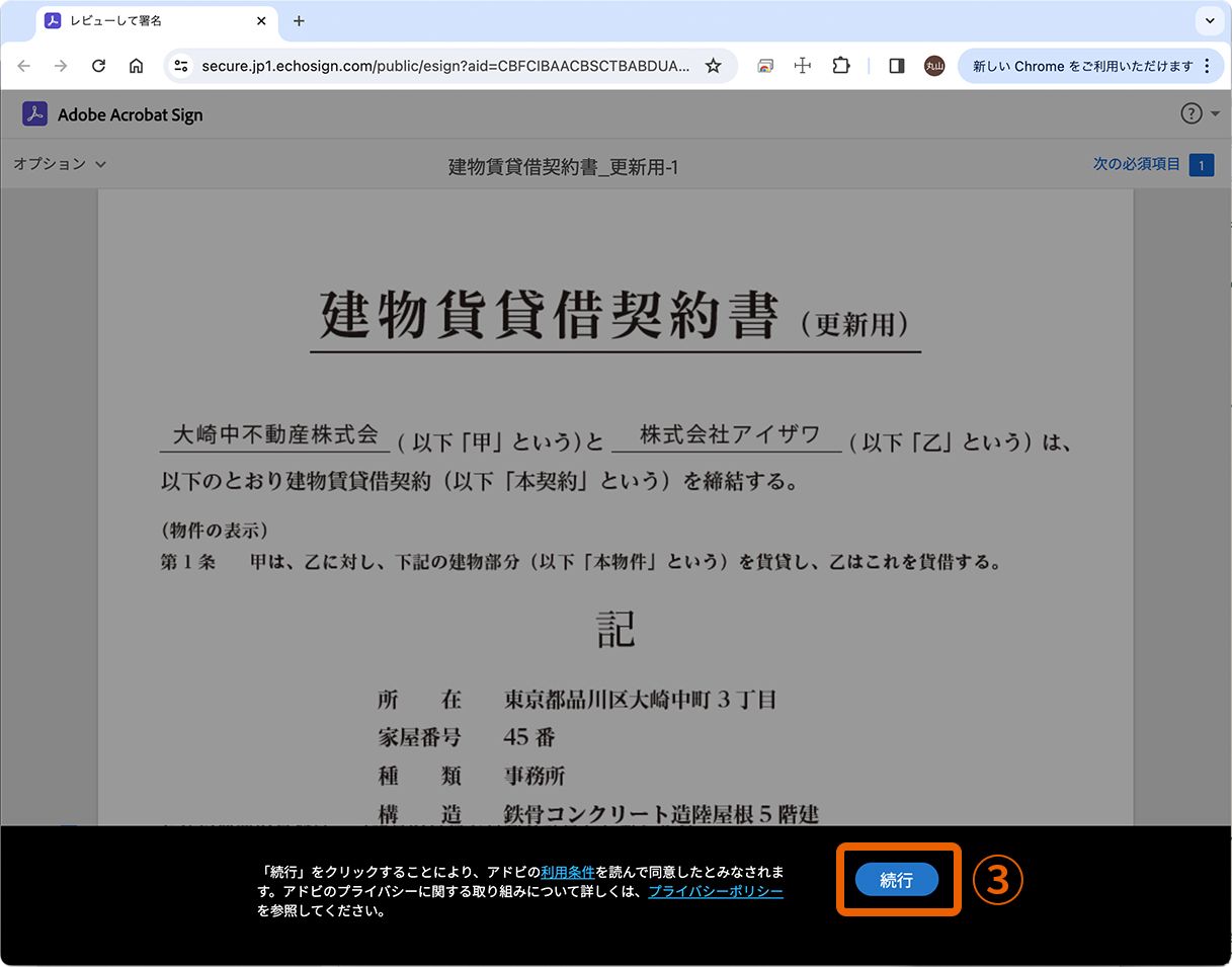 2. ブラウザーが起動し、契約書が表示されるので「続行」③をクリックして署名を開始します。