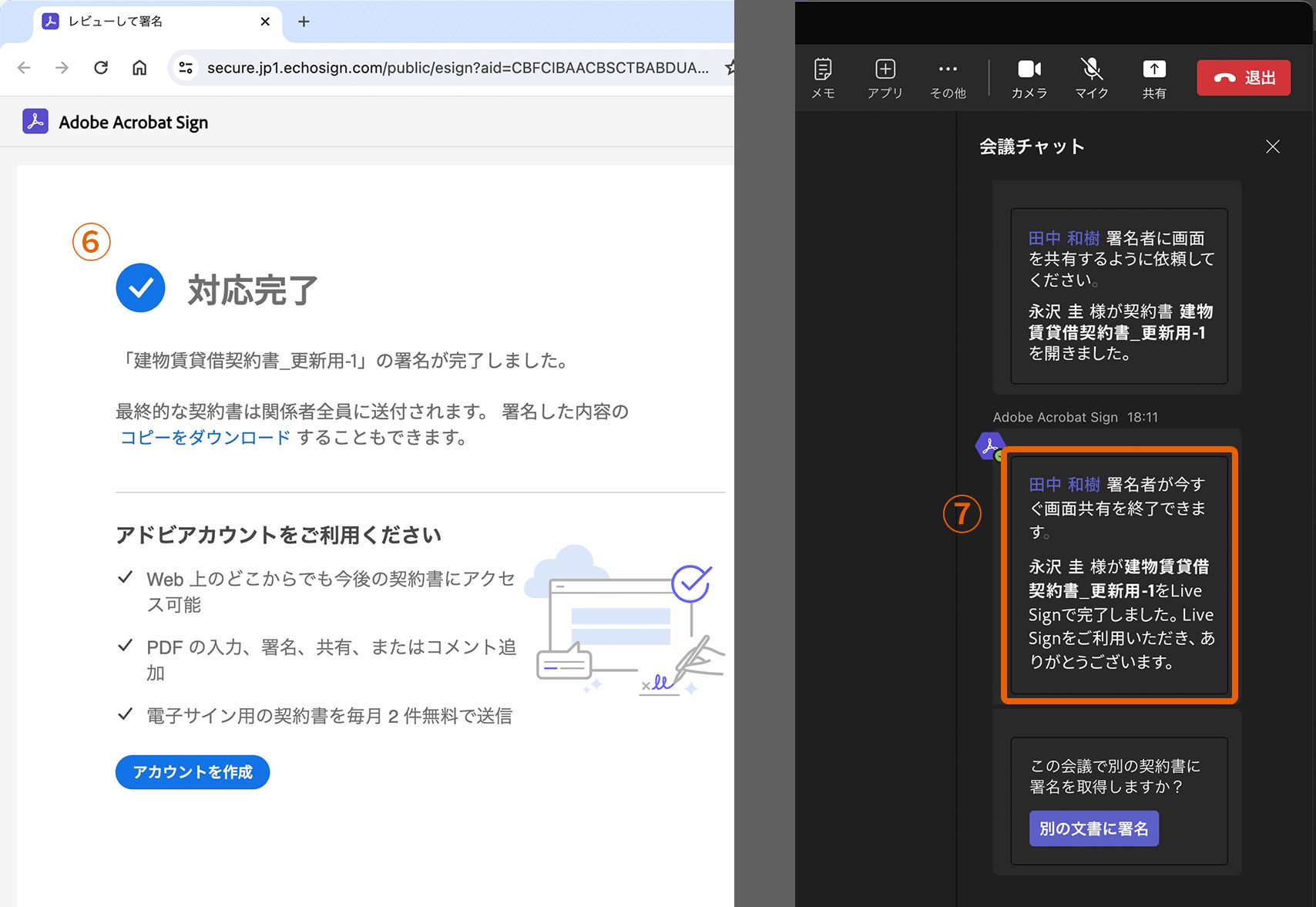 4. ブラウザーに署名が完了したメッセージ⑥が表示されます。Teamsの「会議チャット」パネルには、署名者がLive Signで署名を完了したメッセージ⑦が表示されます。
