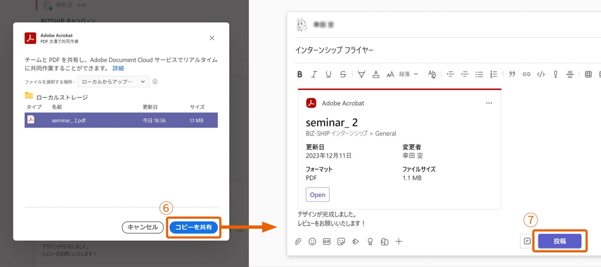 3. 共有レビューするファイルが選択されているのを確認して「コピーを共有」⑥をクリックします。投稿の画面に戻り「投稿」⑦をクリックして共有レビューを開始します。