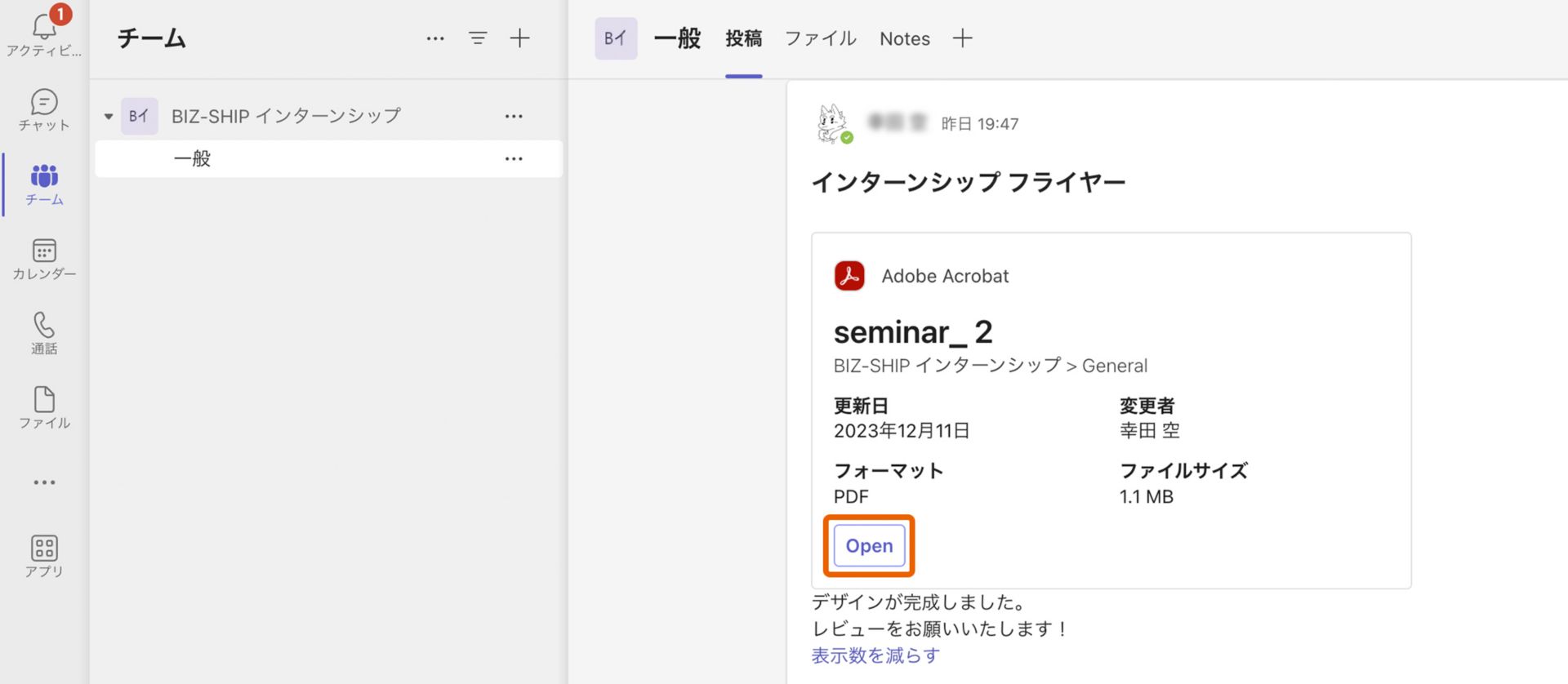 1. レビュー担当者は、Teamsの投稿内にアップされた文書の「Open」をクリックして文書を開き、注釈やコメントを追加し、結果を他のレビュー担当者と共有することができます。
