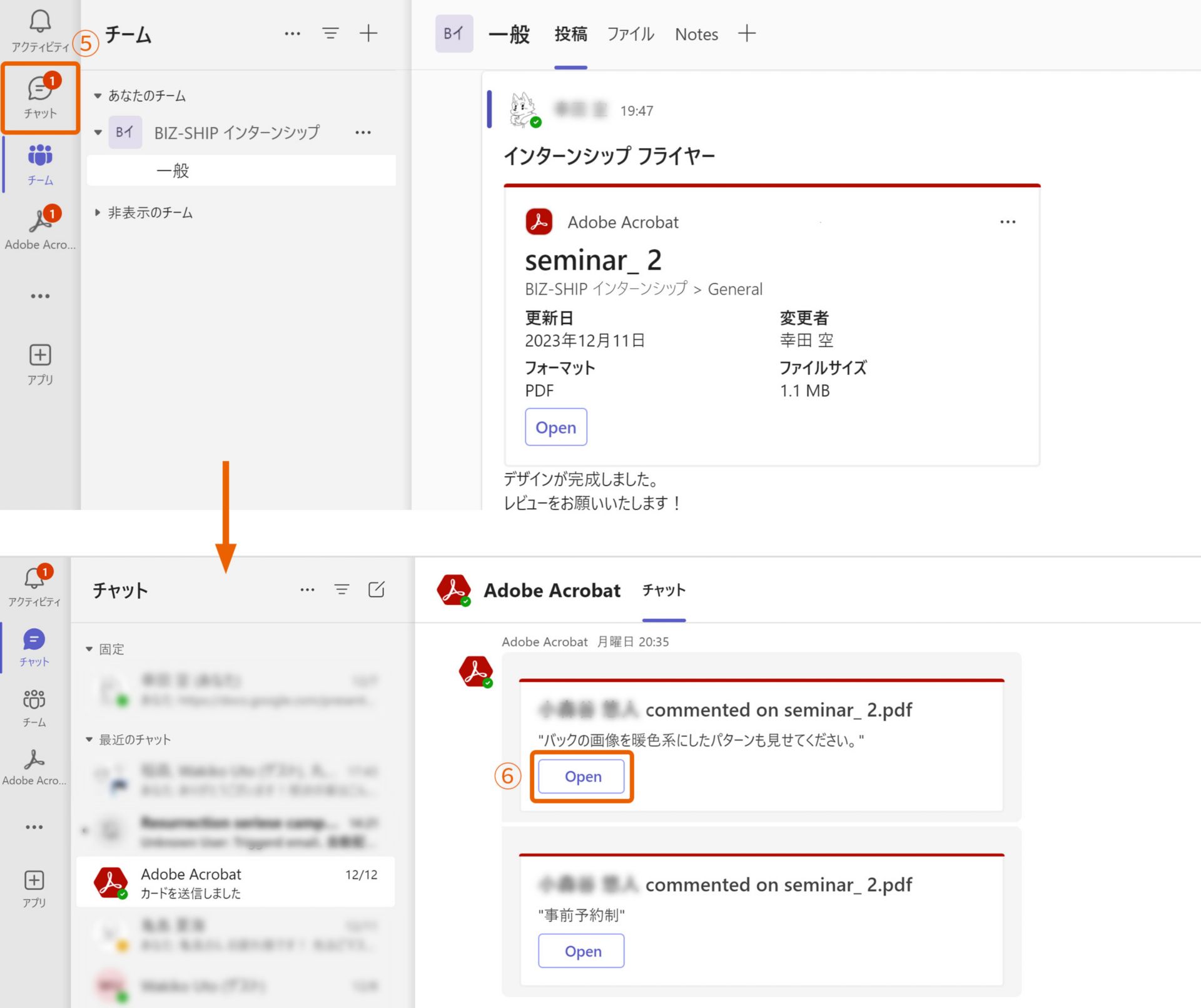 2. レビュー関係者は、Teamsのチャットボットに未読通知の数字が表示され⑤、開くと注釈の履歴を見ることができます。「Open」⑥をクリックすると注釈の内容を確認することができます。コメントに対して返信することもでき⑦、Teams内においてリアルタイムでレビューのやりとりをすることができます。