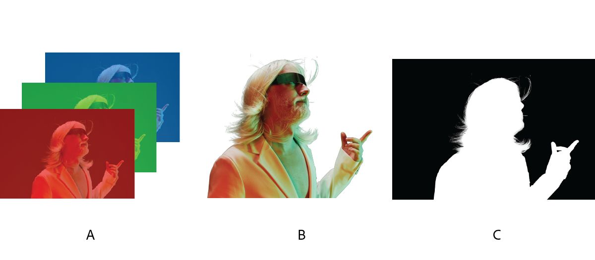 A. 分割されたカラーチャンネル B. グレースケールイメージで表されたアルファチャンネル C. 透明な部分を通して表示される背景が設定された 4 つのすべてのチャンネルを使用するコンポジット