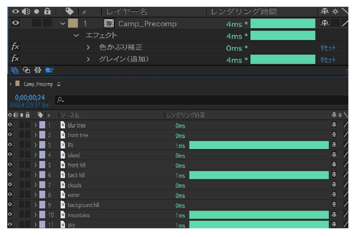 コンポジション - プリコンポジションにネストされたレイヤーには、レンダリング時間が正確に表示されます。プリコンポジションのどのエレメントがレイヤーのレンダリング時間に貢献しているかをさらに理解するには、コンポジションプロファイラーでプリコンポジションを開き、そのレイヤーを調べる必要があります。