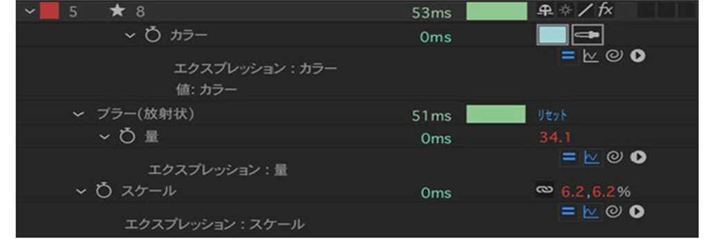 エクスプレッションの計算時間は、エクスプレッションが含まれるプロパティの「レンダリング時間」列で確認できます。ほとんどのエクスプレッションは高速に実行されるので、0 ミリ秒と表示されます。