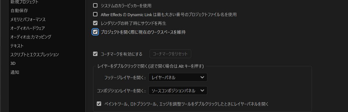 After Effects の新しい環境設定では、別のワークスペースで保存されたプロジェクトを開くときに、現在のワークスペースレイアウトを維持できます。 「プロジェクトを開く際に現在のワークスペースを維持」オプション(環境設定/一般/プロジェクトを開く際に現在のワークスペースを維持)を有効にすると、レイアウトの一貫性が保持され、新しいプロジェクトを開くたびにワークスペースを並べ替える必要がなくなります。 これにより、作業しているプロジェクトに関係なく、ワークスペースが変更されずに保持されます。