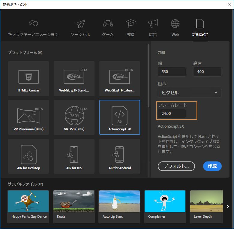 デフォルトの FLA 形式での Animate ドキュメントの保存
