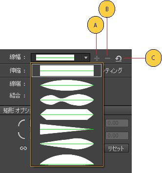 プロパティパネルの線幅プロファイルドロップダウンリストから線幅プロファイルを選択して、線幅プロファイルを選択したパスに適用できます。可変線幅のない線が選択されている場合は、リストに「均等」線幅プロファイルが表示されます。デフォルトの線幅プロファイルを復元するには、「プロファイルを初期化」ボタンをクリックします。