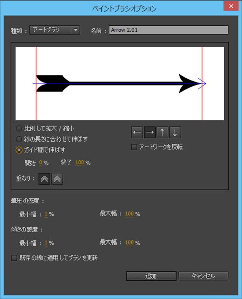ブラシの編集アイコンは、選択したブラシのブラシを編集ダイアログボックスを起動します。編集するアートブラシを選択すると、アートブラシオプションダイアログボックスが表示されます。ブラシの方向、拡大/縮小設定および重なり設定などのプロパティを変更して、変更を既存の線に適用できます。