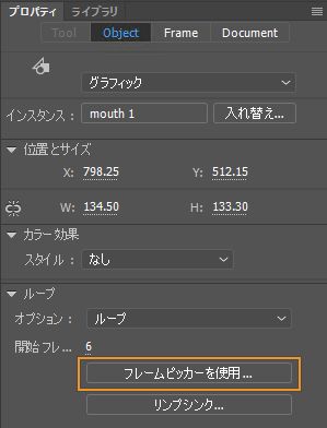 フレームピッカーパネルはグラフィックシンボルに対してのみ使用でき、ムービークリップタイプやボタンシンボルタイプに対しては無効になります。この機能を使用するには、アセットをシンボルに変換する必要があります。