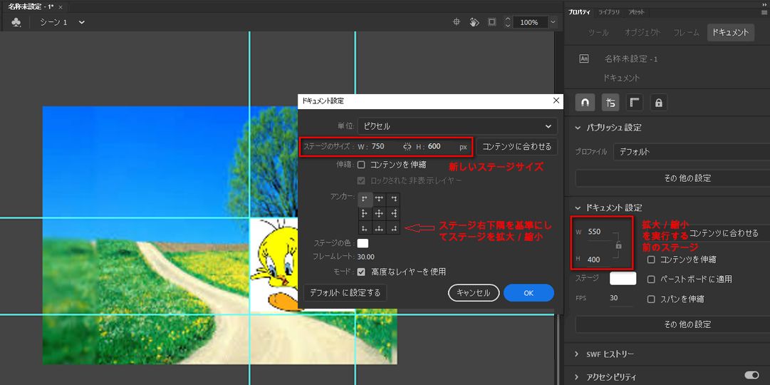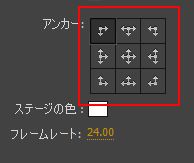 ドキュメント設定でアンカーポイントを選択し、高さと幅を指定して、ステージをそのサイズに拡大/縮小できます。「コンテンツを拡大/縮小」を無効にすると、次の図に示すように、選択したアンカーポイントに従って各方向にステージが拡大されます。