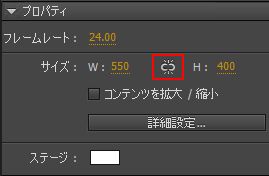 「コンテンツを拡大/縮小」オプションを選択すると、ステージのサイズが自動的にリンクされ、無効になります。これは、コンテンツの拡大/縮小は、ステージのサイズが比例して変更される場合に意味をなすからです。