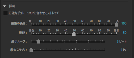 - リミックスグループの「ターゲットデュレーション」でデュレーションを調整します。