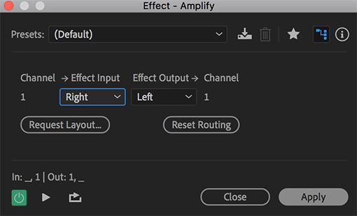 エフェクトの操作時に、さまざまな入力 / 出力チャンネルを割り当てたり、サポートされているさまざまなチャンネル設定を問い合わせたりできます。特定のオーディオクリップまたはトラックチャンネルをモノラル、ステレオ、またはサラウンド / イマーシブエフェクトに簡単にルーティングしたり、既存のルーティング設定を一目で迅速に確認したりできます。
