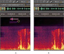 エディターパネルで、スペクトル表示のオーディオのノイズ箇所をクリックして押さえたままにするか、ドラッグします。注意: