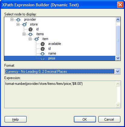 XPATH Expression Builder(動的テキスト)ダイアログボックス この選択により、XSLT ページに次のコードが挿入されます。