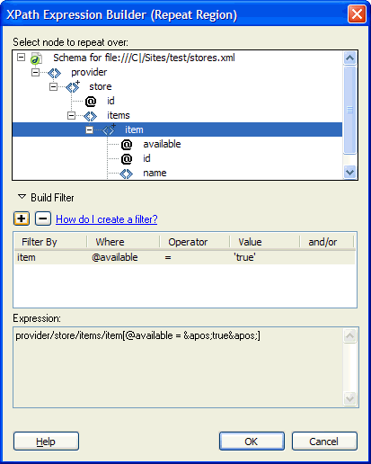この機能は、特定のノードを識別する、またはリピート領域のための単純な XPath 式を作成できるように設計されています。手動で式を編集することはできません。複雑な式を作成する必要があるときは、最初に XPATH 式ビルダーを使って式を作成し、次にコードビュー内、またはプロパティインスペクターを使って式をカスタマイズします。