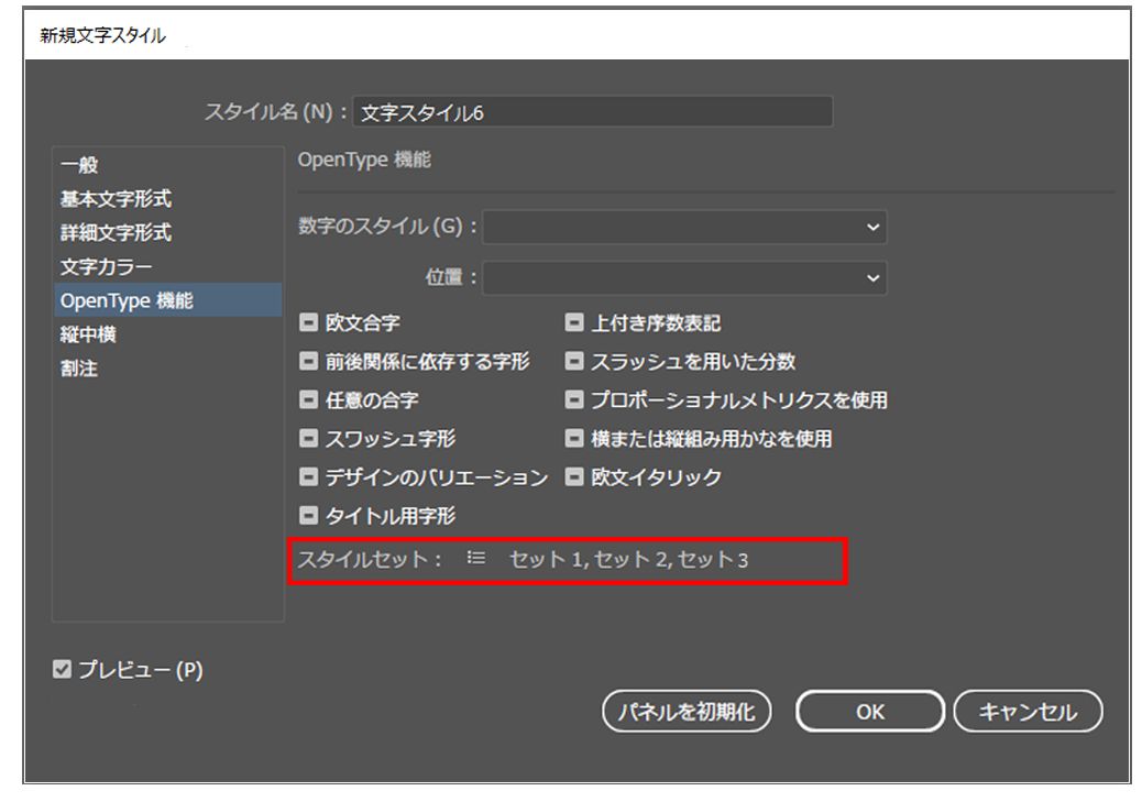 - OpenType フォントを使用しているときに、欧文用字形の自動置換ダイアログボックスではなく、OpenType パネルを選択して合字と分数を調節します。