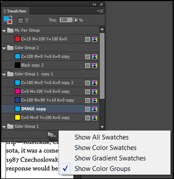 カラーグループ情報を含む .idml ファイルを前のバージョンで開いた場合、前のバージョンではカラーグループを使用できないので、スウォッチパネルにはカラーグループがないフラットなスウォッチリストが表示されます。