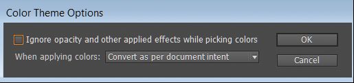 Color テーマツールをダブルクリックします。カラーを選択してスウォッチに追加すると、カラーはドキュメントのインテントに従って自動的に適切なカラースペースに変換されてから、スウォッチに追加または他のオブジェクトにドロップされます。選択肢として 3 つのオプションが提供されます。
