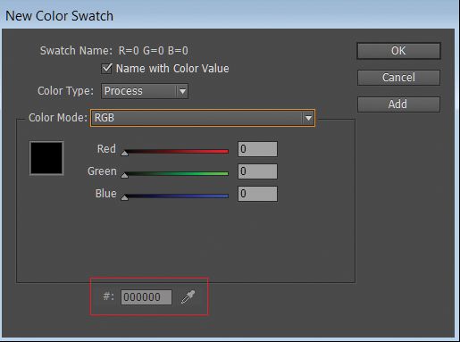 新規スウォッチ - 16 進値 新規スウォッチ - 16 進値 - スウォッチを編集:スウォッチを編集して、その 16 進値を変更することもできます。スウォッチをダブルクリックして、「カラーモード」ドロップダウンから「RGB」を選択します。