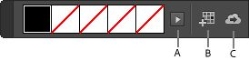 Color テーマツール - オプション A. クリックすると、すべてのテーマが表示されます。 B. スウォッチに現在のカラーテーマを追加します。 C. 現在の CC ライブラリに保存します。