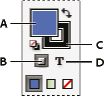 ツールパネルでのカラー適用方法の指定 A. 塗りボックス B. オブジェクトのフォーマット設定に切り替え C. 線ボックス D. テキストのフォーマット設定に切り替え