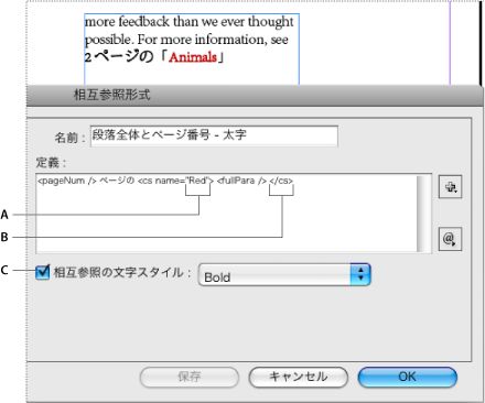 <pageNum> ページの <cs name=”bold”><fullPara/></cs> を参照 23 ページの動物を参照 文字スタイル名を指定し、文字スタイルを適用するテキストを <cs name=""> タグと </cs> タグで囲みます。 相互参照内の文字スタイルの適用を参照してください。 |