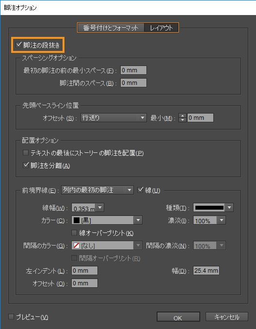 脚注のレイアウトのオプション