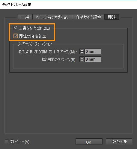 「上書きを有効化」および「脚注の段抜き」をオンにします。
